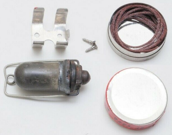 Hierboven zie je drie gaasjes, die voornamelijk de spiraalsgewijs gevouwen lont op het pellet/tablet gedrukt moesten houden. Wellicht dienden de gaasjes ook als katalysator voor de decompositie van de brandstof...?