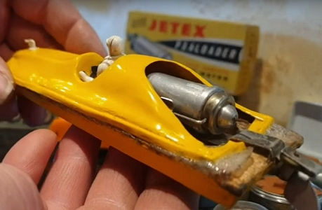 Jetex casing is vastgezet. Rechts een motorbootje met de Jetex aandrijving.